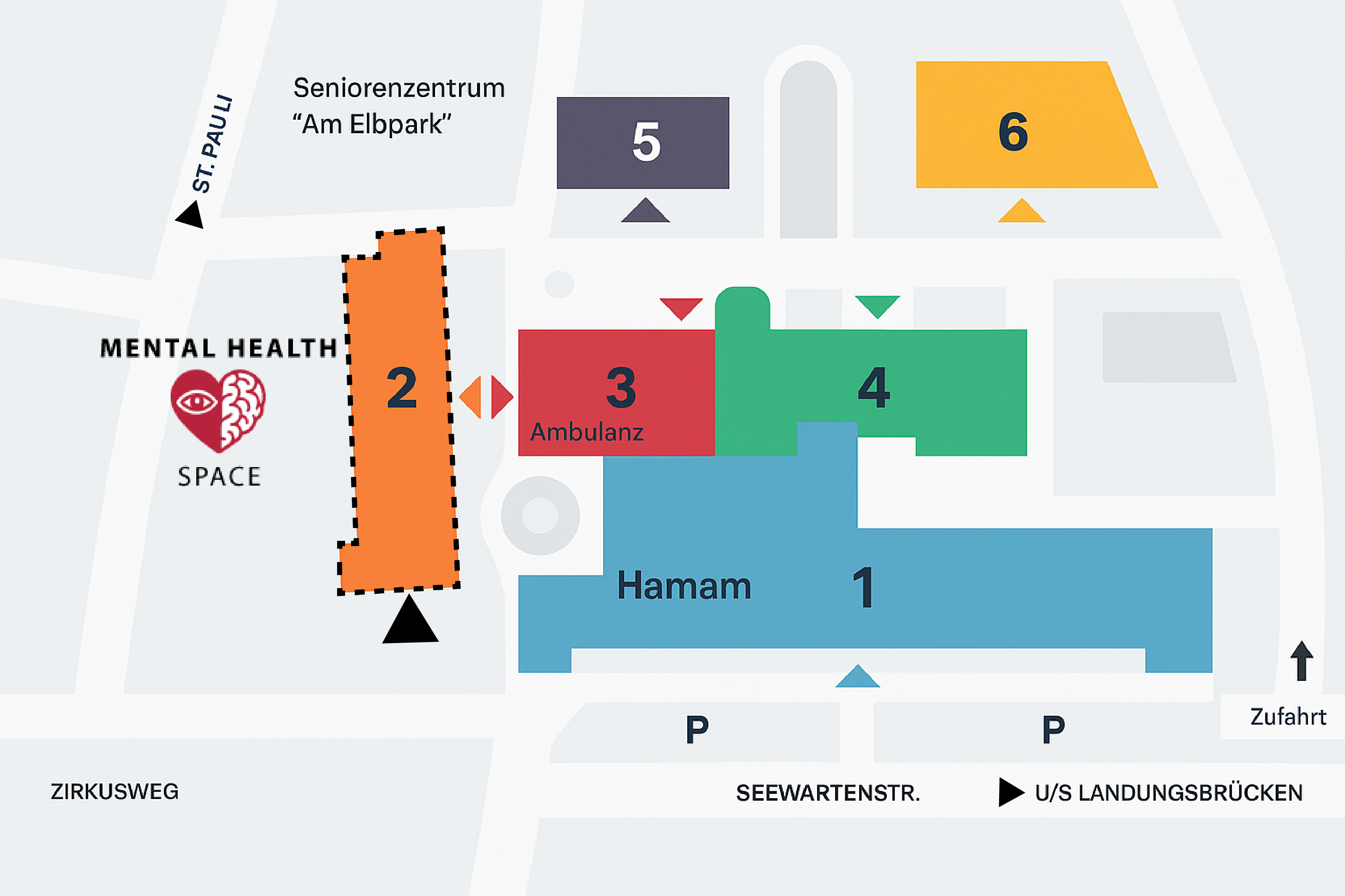 Der kürzeste Zugang geht von der U3 St. Pauli über den Zirkusweg: hier an der neuen Seniorenwohnanlage »Am Elbpark« den Fußweg vorlaufen Richtung Seewartenstraße, nach etwa 80 m links einbiegen ins Zentrumsgelände.